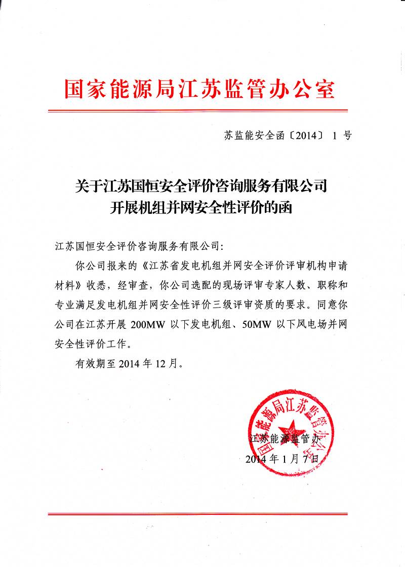 我公司成功獲得發電機組并網安全性評價三級評審資質。2014年1月7日,經國家能源局江蘇監管辦公室認定,我公司可以開展200MW以下發電機組,50MW以下風電場并網安全性評價工作。